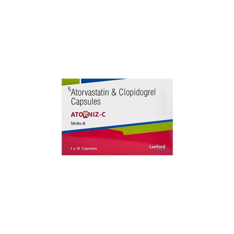 Atorniz-C Capsule is a combination formulation containing Atorvastatin and Clopidogrel. Atorvastatin helps lower bad cholesterol (LDL) and triglycerides while increasing good cholesterol (HDL). Clopidogrel is an antiplatelet agent that helps prevent blood clot formation by keeping platelets from sticking together. This dual-action combination helps reduce the risk of heart attack, stroke, and other cardiovascular complications. Atorniz-C Capsule should be taken with food to avoid stomach upset. You should take it regularly at evenly spaced intervals as per the schedule prescribed by your doctor. Taking it at the same time every day will help you remember to take it. The dose and duration of treatment will depend on what you are being treated for. Do not stop taking it until you have finished the complete course, even when you feel better. Lifestyle changes like low-fat diet, exercise and not smoking may help this medicine to work better.